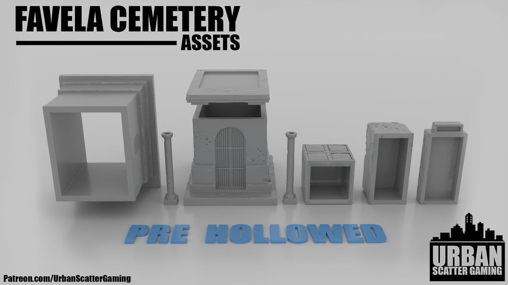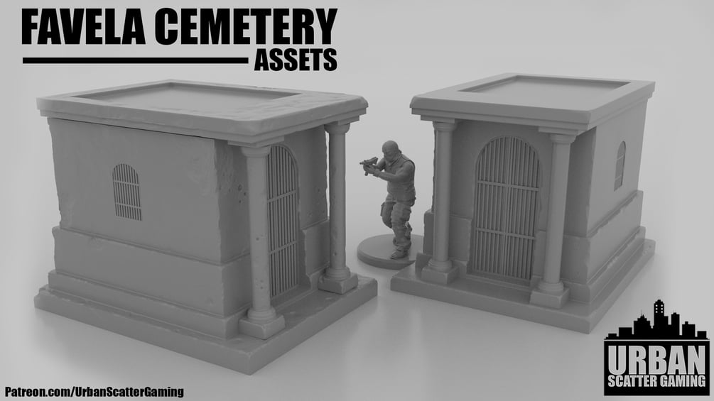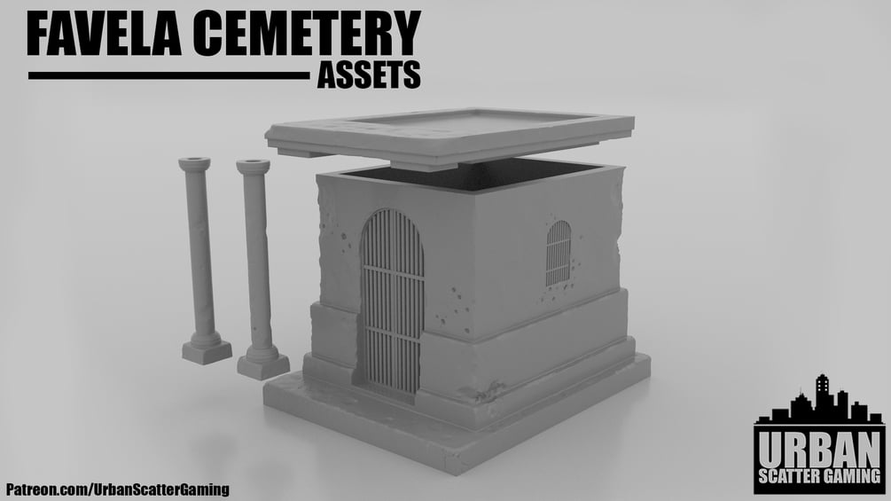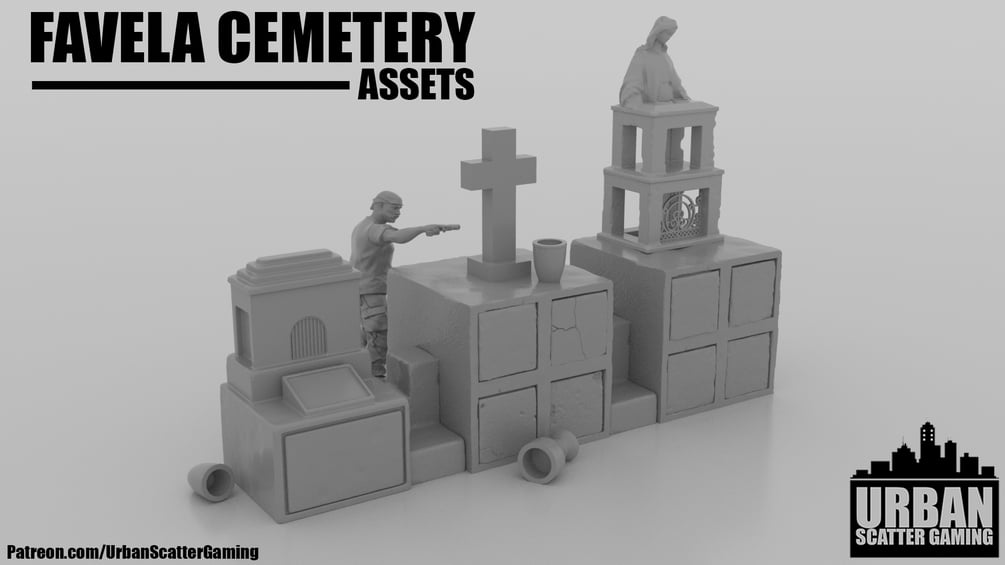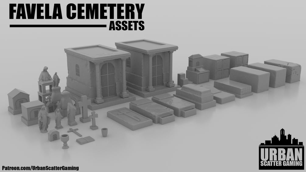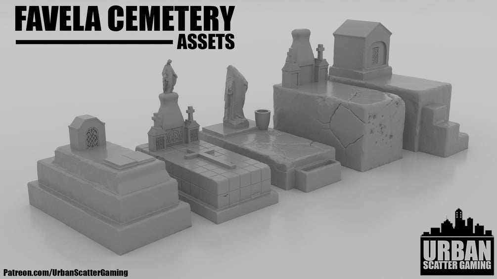 I present to you my FAVELA CEMETERY assets. This pack contains models consistent with a Mexican/Favela/South American style cemetery. Perfect for any Cartel missions, it could certainly make for an interesting battlefield. This set comes with a Plethora of gravestones, Mausoleum's and decorations to make a graveyard befitting of any gameboard or diorama.