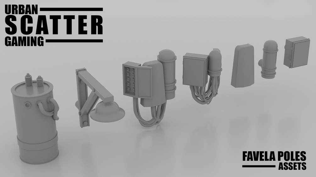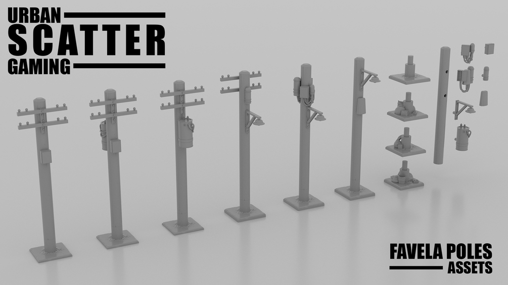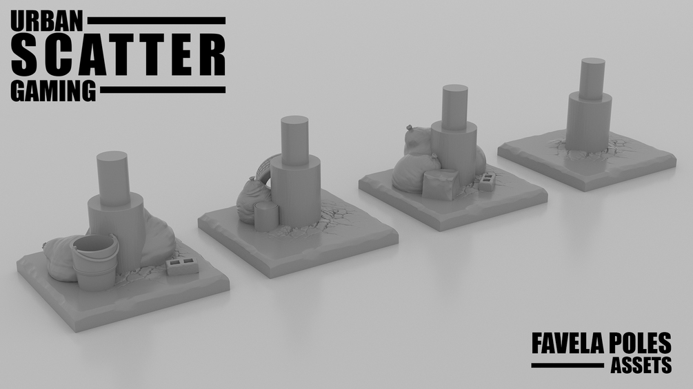 I present to you my Favela/Slum Pole assets. Perfect for any modern or post apocalyptic setting originally designed for a Favela/Slum scenario but could be used in any urban setting. It contains a set of Wooden poles, bases and objects that can be used to detail your scenery or diorama's.