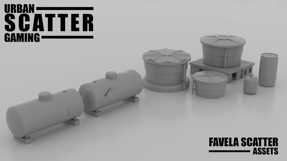 - Rooftop Water Container (Small and Large sizes with various bases and lids.... just search favela rooftop)