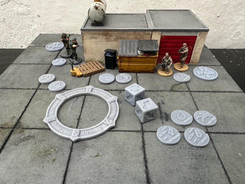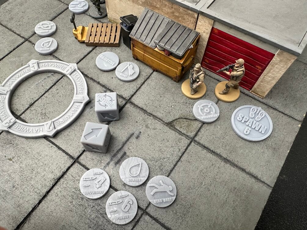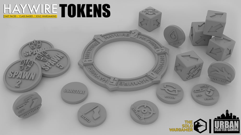 I present here a full set of printable gaming tokens to accompany the FREE solo tabletop skirmish game "HAYWIRE".