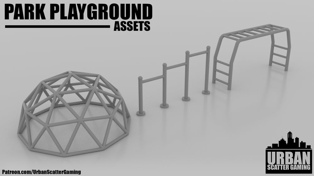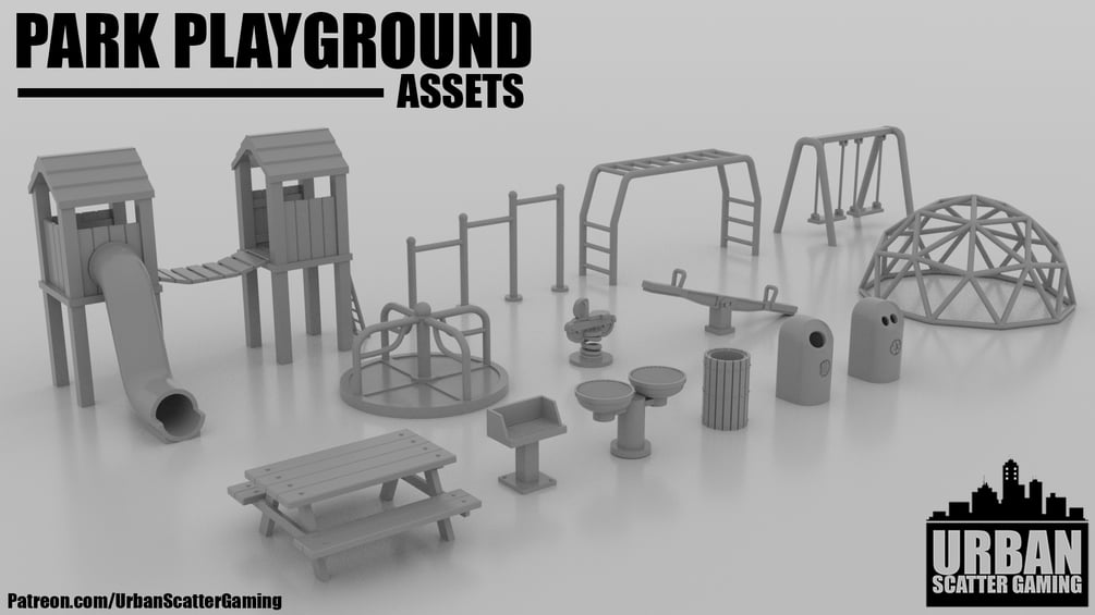 Whether you're designing a modern park, a post-apocalyptic wasteland with a long-forgotten playground, or a war-torn zone filled with rusted and neglected equipment, this set is perfect for all your gaming needs. The versatility of the playground items allows them to fit into a wide array of settings—be it a Mexican favela, a Middle Eastern battleground, or a European war zone, adding rich detail and dynamic gameplay opportunities.