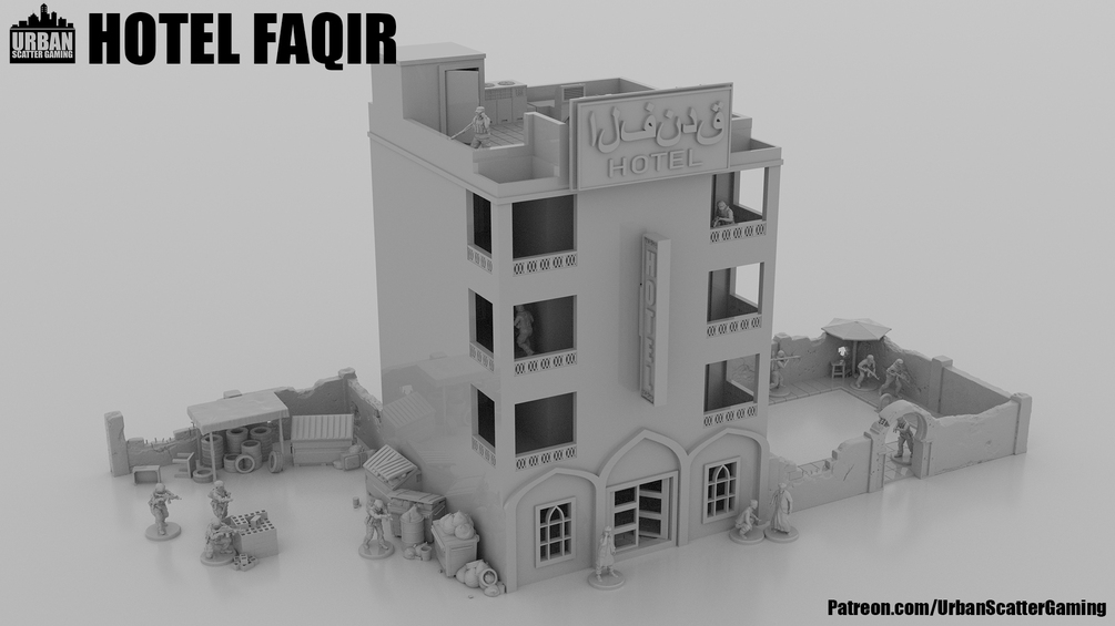 Designed for FDM printing at 28mm scale, Hotel Faqir is a highly detailed, multi-story building perfect for bringing your Middle Eastern tabletop setting to life. Whether it serves as a key objective for room-clearing operations or the site of a high-stakes bomb defusal, this structure offers endless gameplay possibilities.