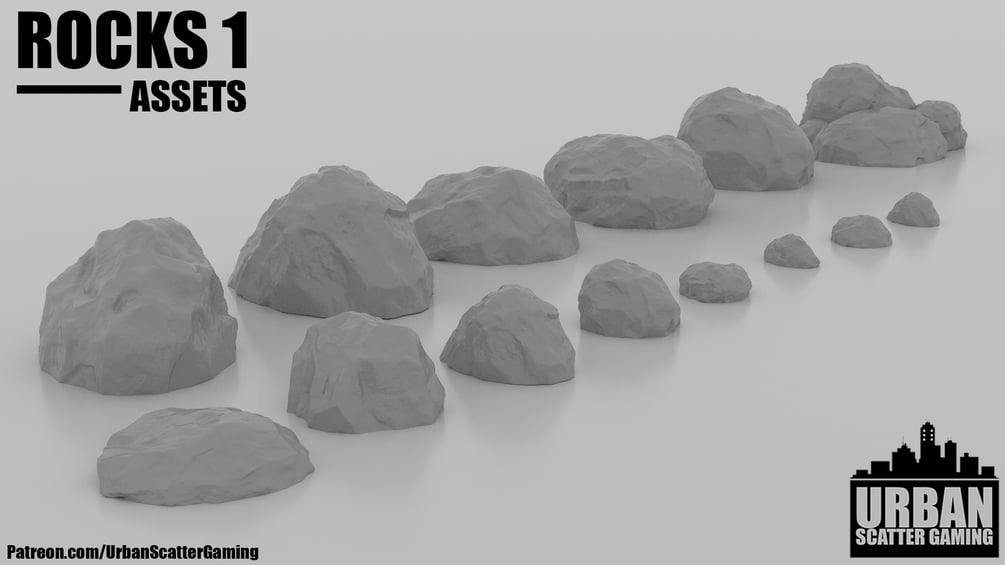 I present to you my Rocks 1 assets. This pack contains 14 Generic rocks in various sizes. Due to the generic nature of these designs it means they can be used in pretty much any setting you wish from Desert plains to snowy mountains and everything in between. Ideal for basing or using as standalone objects. They have also been pre hollowed to save maximum material whilst printing.